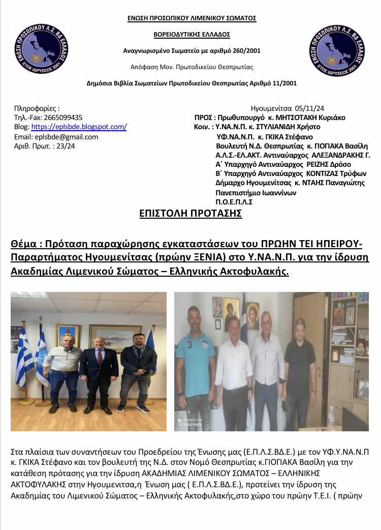 Στα πλαίσια των συναντήσεων του Προεδρείου της Ένωσης μας (Ε.Π.Λ.Σ.ΒΔ.Ε.) με τον ΥΦ.Υ.ΝΑ.Ν.Π κ. ΓΚΙΚΑ Στέφανο και τον βουλευτή της Ν.Δ. στον Νομό Θεσπρωτίας κ.ΓΙΟΓΙΑΚΑ Βασίλη για την κατάθεση πρότασης για την ίδρυση ΑΚΑΔΗΜΙΑΣ ΛΙΜΕΝΙΚΟΥ ΣΩΜΑΤΟΣ – ΕΛΛΗΝΙΚΗΣ ΑΚΤΟΦΥΛΑΚΗΣ στην Ηγουμενιτσα,η Ένωση μας ( Ε.Π.Λ.Σ.ΒΔ.Ε.), προτείνει την ίδρυση της Ακαδημίας του Λιμενικού Σώματος – Ελληνικής Ακτοφυλακής,στο χώρο του πρώην Τ.Ε.Ι. ( πρώην