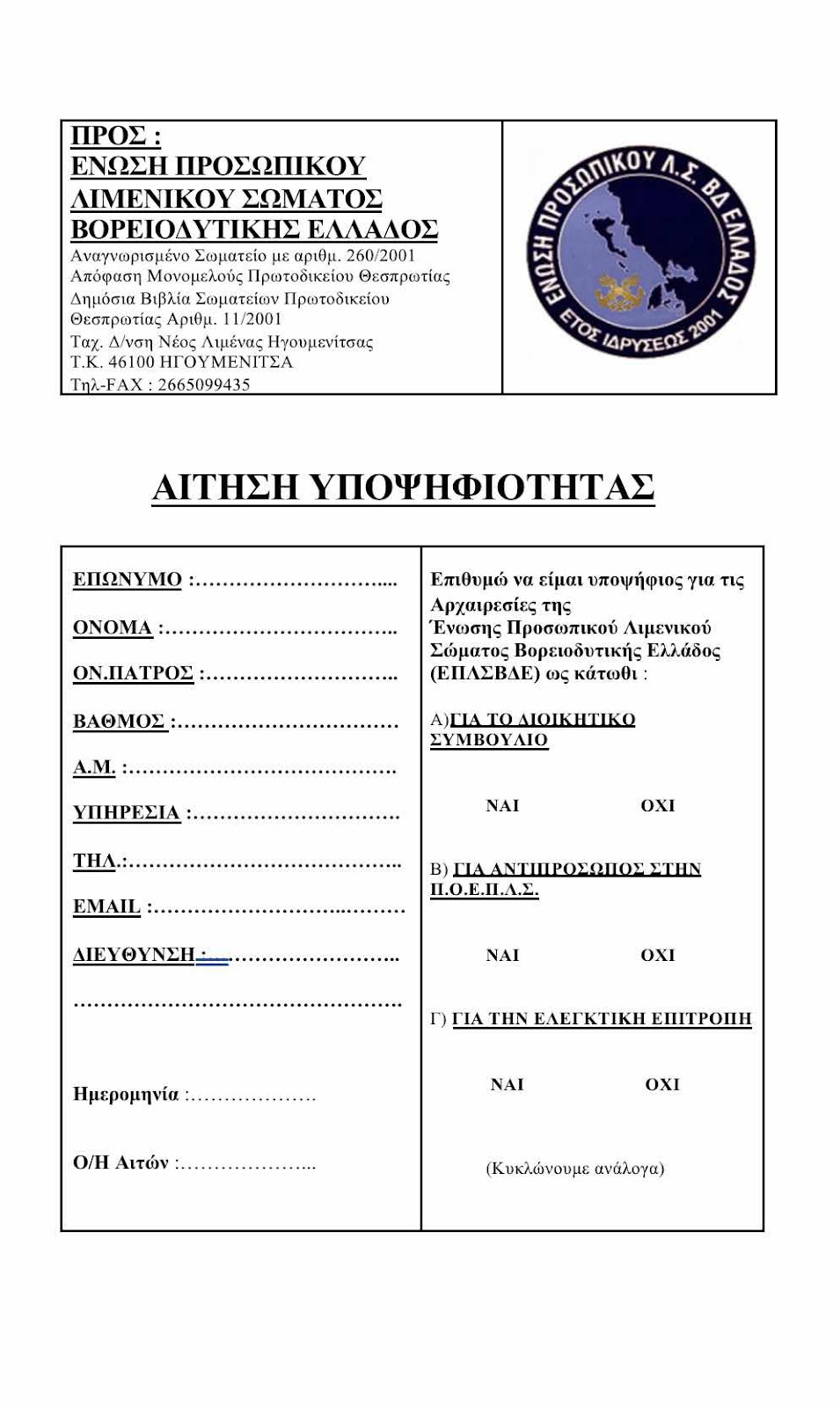 Ε.Π.Λ.Σ.ΒΔ.Ε. : ΑΙΤΗΣΗ ΥΠΟΨΗΦΙΟΤΗΤΑΣ