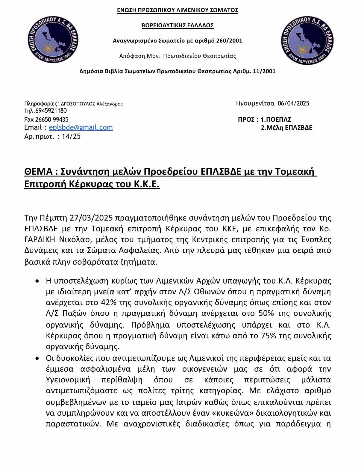 Την Πέμπτη 27/03/2025 πραγματοποιήθηκε συνάντηση μελών του Προεδρείου της ΕΠΛΣΒΔΕ με την Τομεακή επιτροπή Κέρκυρας του ΚΚΕ, με επικεφαλής τον Κο. ΓΑΡΔΙΚΗ Νικόλαο, μέλος του τμήματος της Κεντρικής επιτροπής για τις Ένοπλες Δυνάμεις και τα Σώματα Ασφαλείας.Από την πλευρά μας τέθηκαν μια σειρά από βασικά πλην σοβαρότατα ζητήματα.
