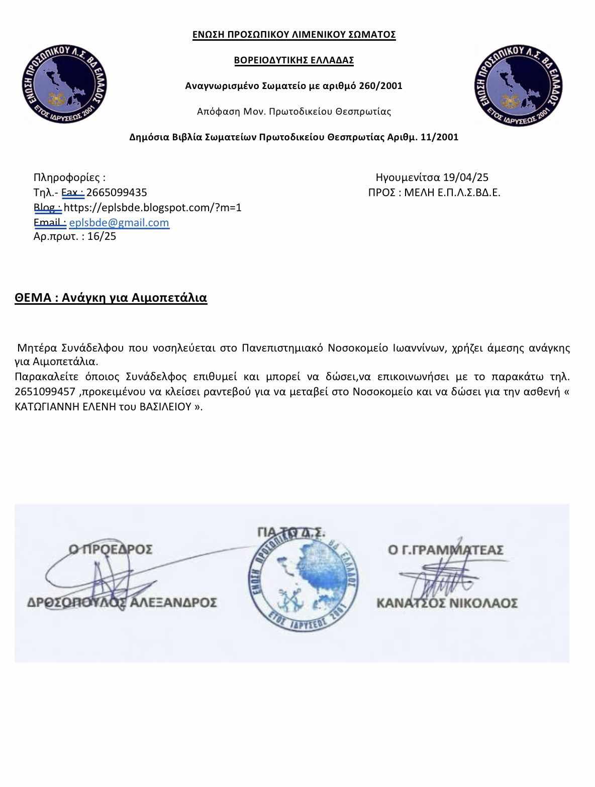 Παρακαλείτε όποιος Συνάδελφος επιθυμεί και μπορεί να δώσει,να επικοινωνήσει με το παρακάτω τηλ. 2651099457 ,προκειμένου να κλείσει ραντεβού για να μεταβεί στο Νοσοκομείο και να δώσει για την ασθενή « ΚΑΤΩΓΙΑΝΝΗ ΕΛΕΝΗ του ΒΑΣΙΛΕΙΟΥ ».