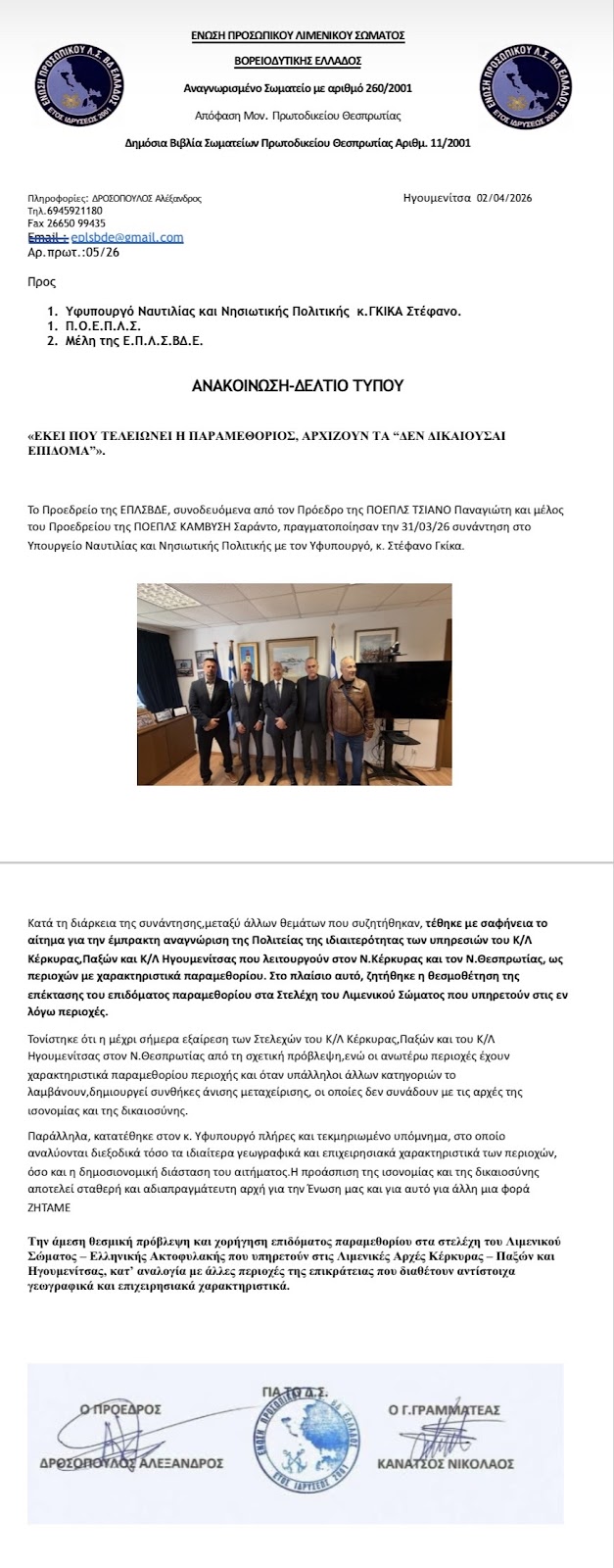Το Προεδρείο της ΕΠΛΣΒΔΕ, συνοδευόμενα από τον Πρόεδρο της ΠΟΕΠΛΣ ΤΣΙΑΝΟ Παναγιώτη και μέλος του Προεδρείου της ΠΟΕΠΛΣ ΚΑΜΒΥΣΗ Σαράντο, πραγματοποίησαν την 31/03/26 συνάντηση στο Υπουργείο Ναυτιλίας και Νησιωτικής Πολιτικής με τον Υφυπουργό, κ. Στέφανο Γκίκα.